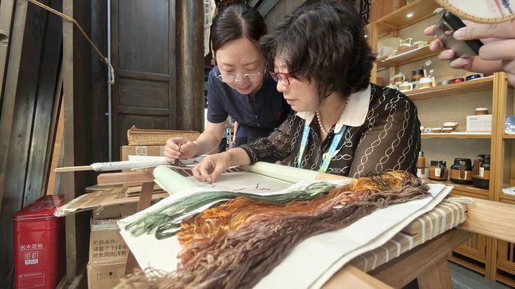 成都大运会期间,媒体记者体验蜀绣技艺。光明网记者董腾飞/摄