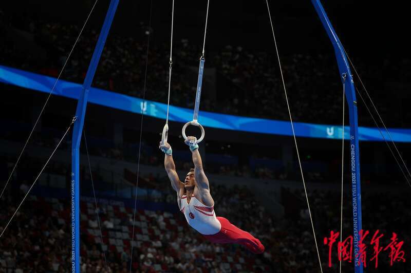 8月5日,四川省成都市,成都大运会体操男子吊环决赛,土耳其选手在比赛中。中青报·中青网记者 赵迪/摄
