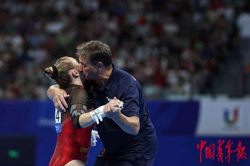 8月5日,四川省成都市,成都大运会体操女子高低杠决赛后,教练亲吻西班牙选手LLACER SIRERA Maia。中青报·中青网记者 赵迪/摄