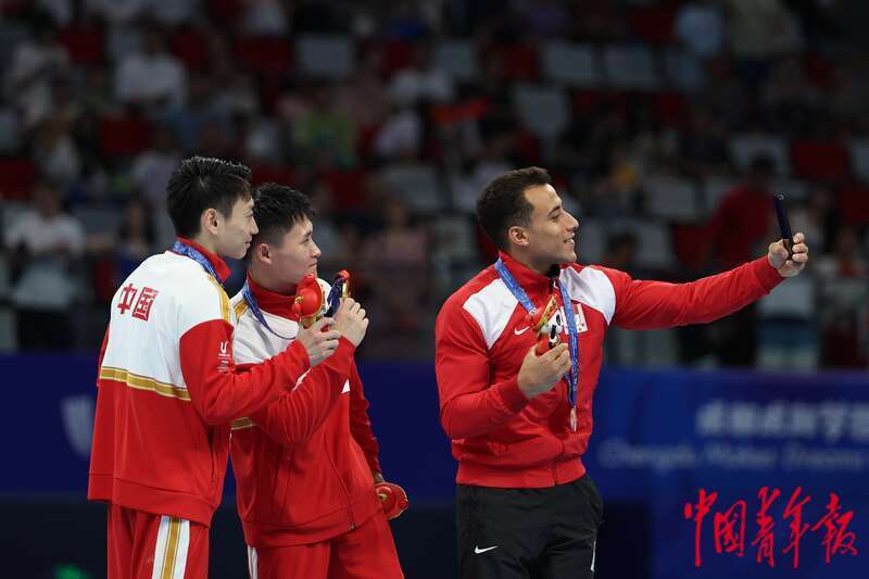 8月5日,四川省成都市,成都大运会体操男子吊环决赛颁奖典礼,中国选手邹敬园(左)、兰星宇(中)和土耳其选手在自拍留念。中青报·中青网记者 赵迪/摄