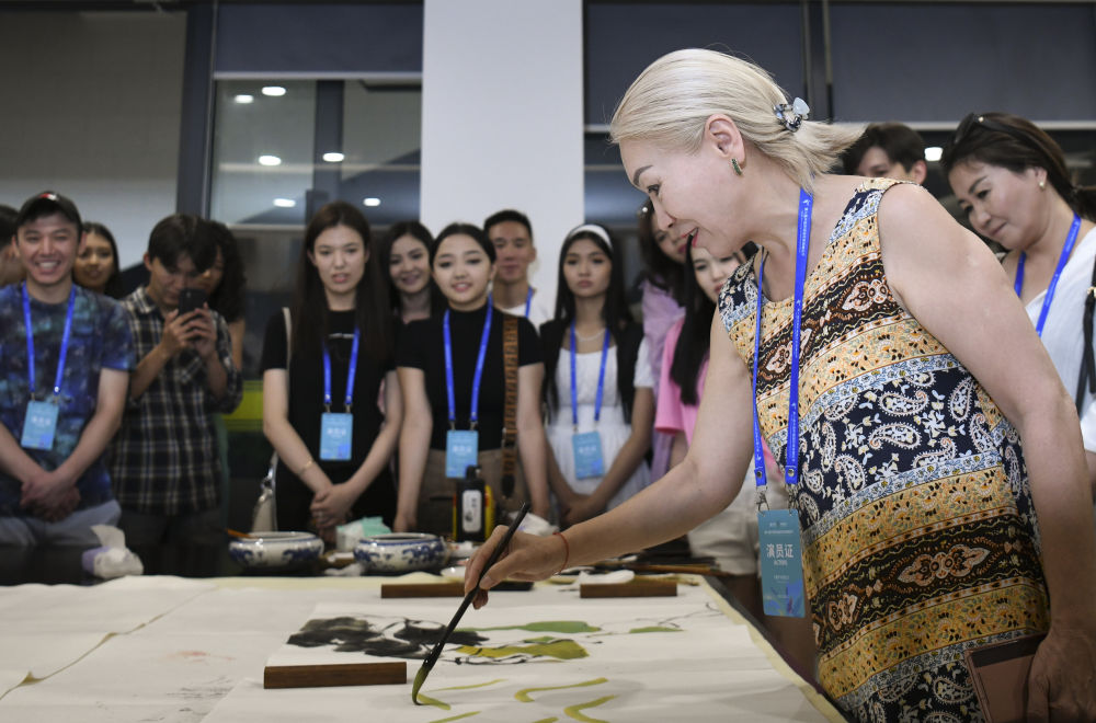 在新疆美术馆,吉尔吉斯斯坦国立白鹿舞蹈团演职人员在体验中国画(7月28日摄)。新华社记者 王菲 摄