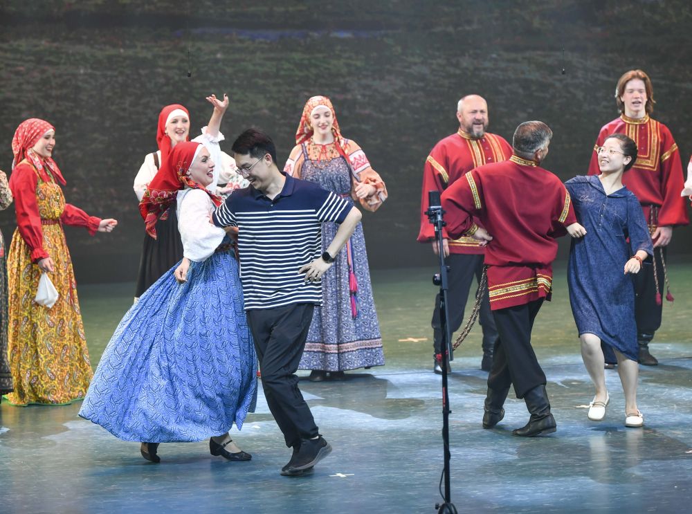 俄罗斯舞团演出结束前,演员热情邀约台下观众登台,与演员们手挽手,欢乐共舞。