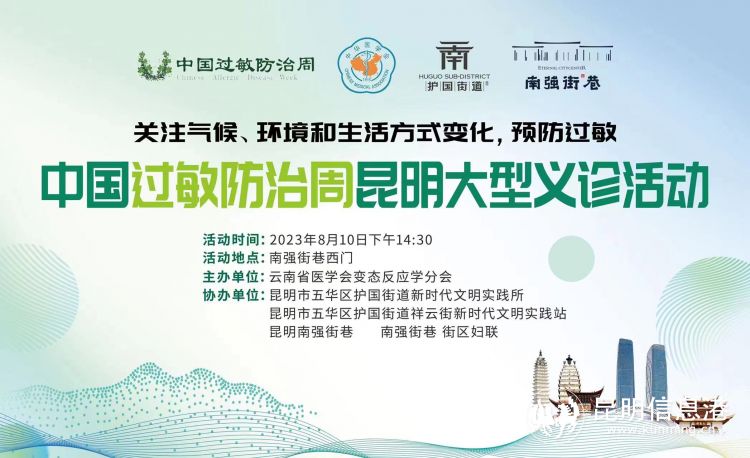 2023年8月7-13日,将迎来第八届“中国过敏防治周“,今年的宣传主题为“关注气候、环境和生活方式变化,预防过敏”。为了做好今年“中国过敏防治周”的宣传,由云南省医学会变态反应学分会主办,昆明市五华区护国街道新时代文明实践所、昆明市五华区护国街道祥云街新时代文明实践站、昆明南强街巷、南强街巷街区妇联联合协办,将于8月10日下午14时30分在“昆明市南强芳香市集-金碧公园口”开展“中国过敏防治周昆明大型义诊活动”。