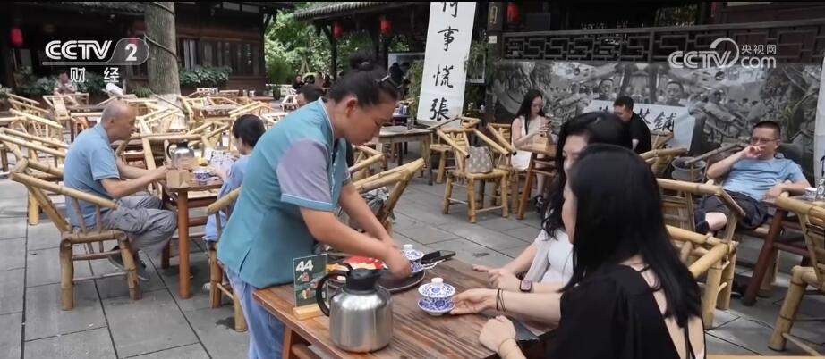 茶铺店长 包静:其实,水街开街我们这边生意还不是特别好,但是随着成都的发展跟网络达人的推广,然后游客们也是口口相传。因为外地人来成都就是三件事,吃火锅、看熊猫、喝坝坝茶,就一定要来感受一下坝坝茶。