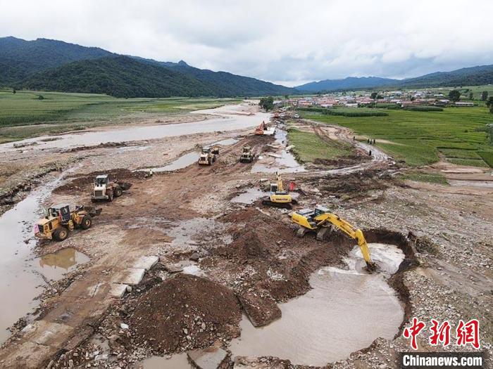 工程车辆正在抢修道路。(无人机照片) 记者 苍雁 摄