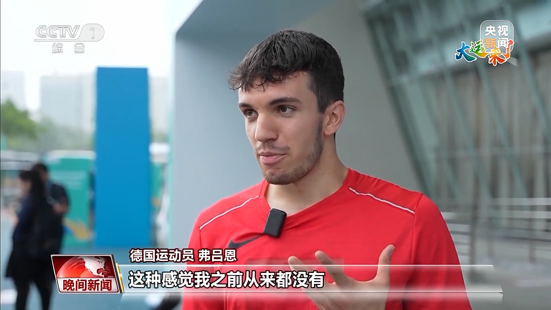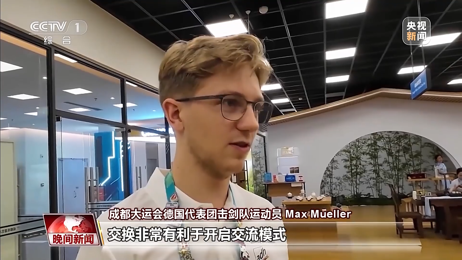 成都大运会德国代表团击剑队运动员 Max Mueller:交换非常有利于开启交流模式,比如,嗨,你好吗,你想要交换徽章吗?然后你就可以开展一段对话,这真的很棒,可以和陌生人聊天。