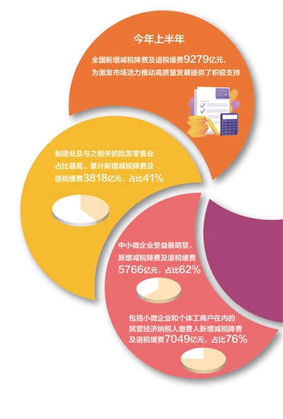 税收是国家实施宏观调控的重要工具。国家税务总局近日发布的数据显示,今年上半年,全国新增减税降费及退税缓费9279亿元。分行业看,制造业及与之相关的批发零售业占比最高,累计新增减税降费及退税缓费3818亿元,占比41%。分企业规模看,中小微企业受益最明显,新增减税降费及退税缓费5766亿元,占比62%。