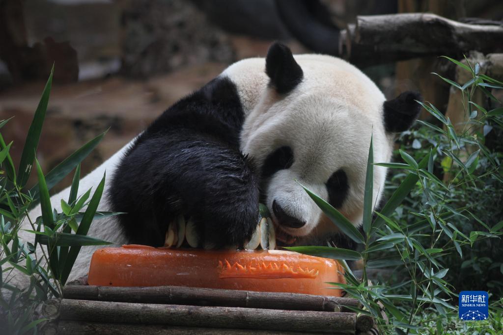 8月5日,在印度尼西亚茂物的印尼野生动物园,大熊猫“彩陶”享用“生日蛋糕”。新华社发(桑迪卡摄)