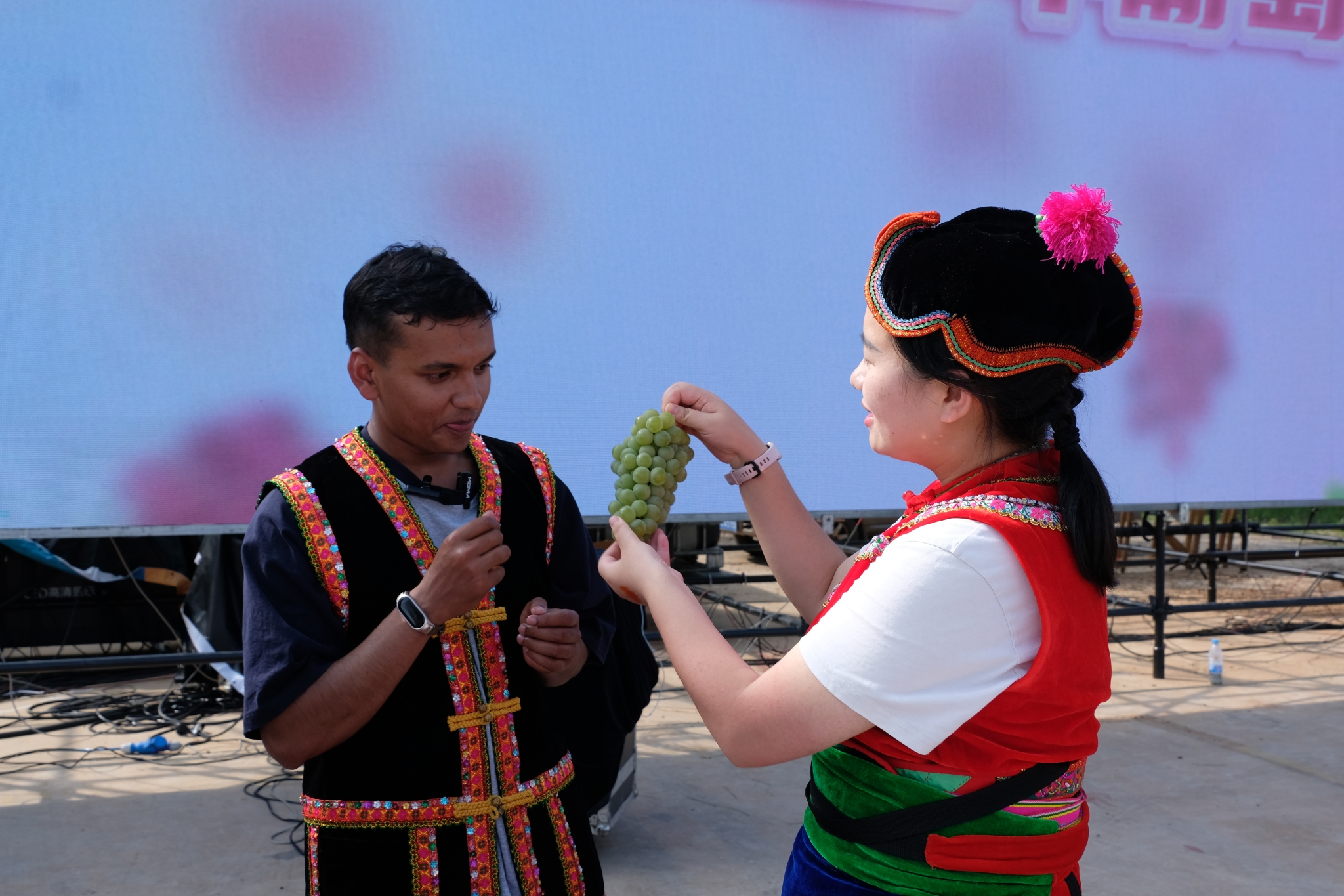 补芸芸向山祖介绍当地特产葡萄。记者曹月/摄