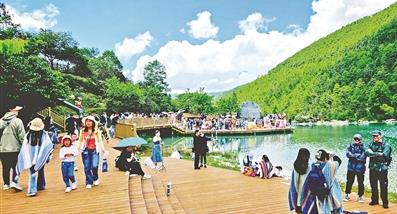 来自全国各地的游客在玉龙雪山景区游玩。 (本报记者 李映芳 摄)
