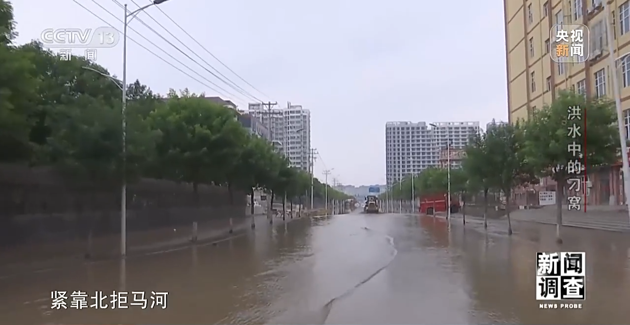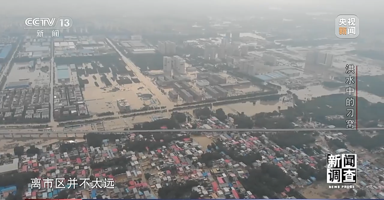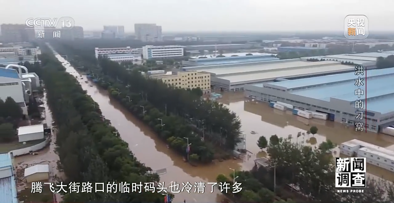 位于涿州市东部的腾飞大街是城区一条主干道,一路向北就是泛滥的北拒马河,河水漫过大堤,把这条原本双向6车道的道路全部淹没,积水达到五六米之深。