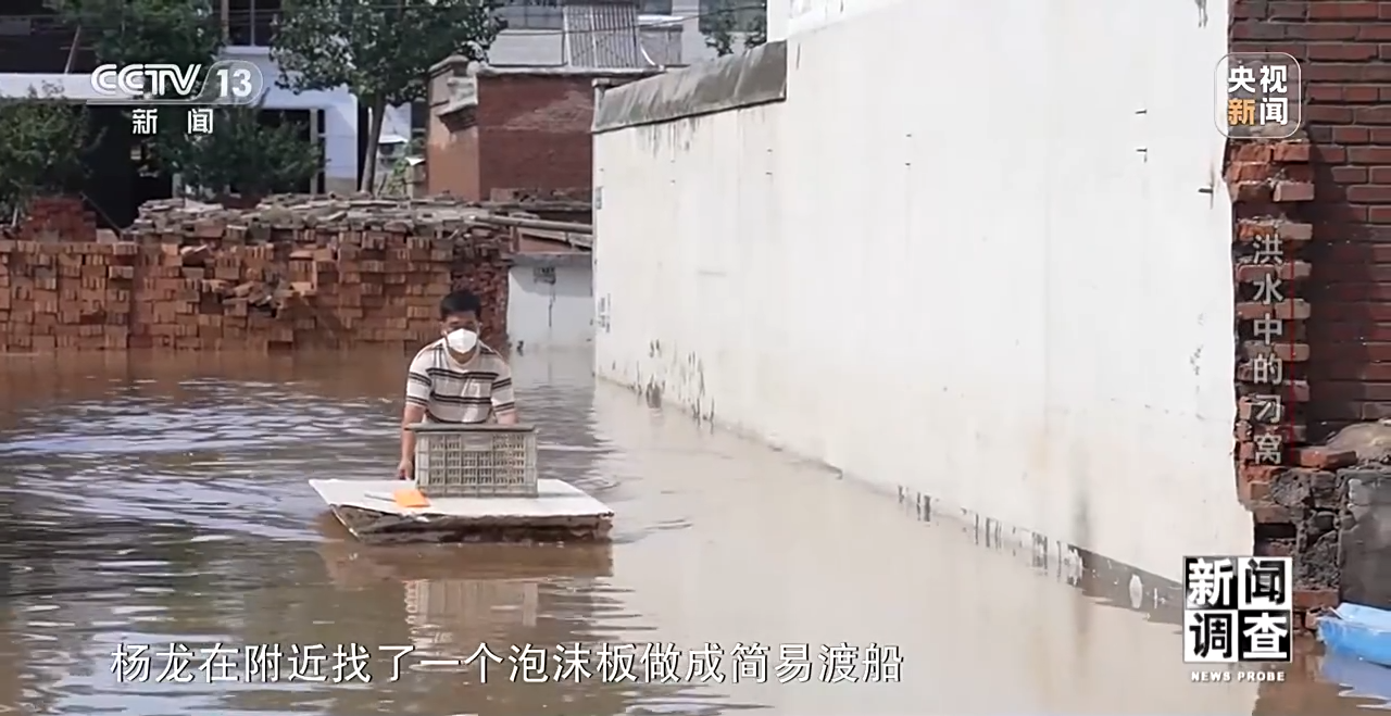 杨龙在附近找了一个泡沫板做成简易渡船。