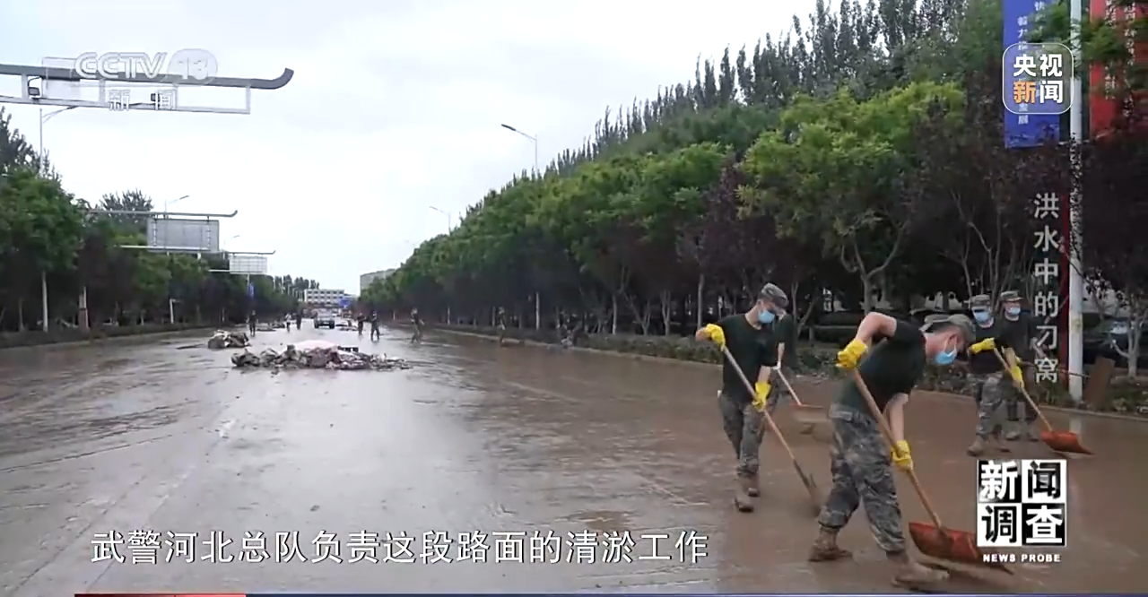 天开始放晴,腾飞大街最南端的300米已经退水,武警河北总队负责这段路面的清淤工作。