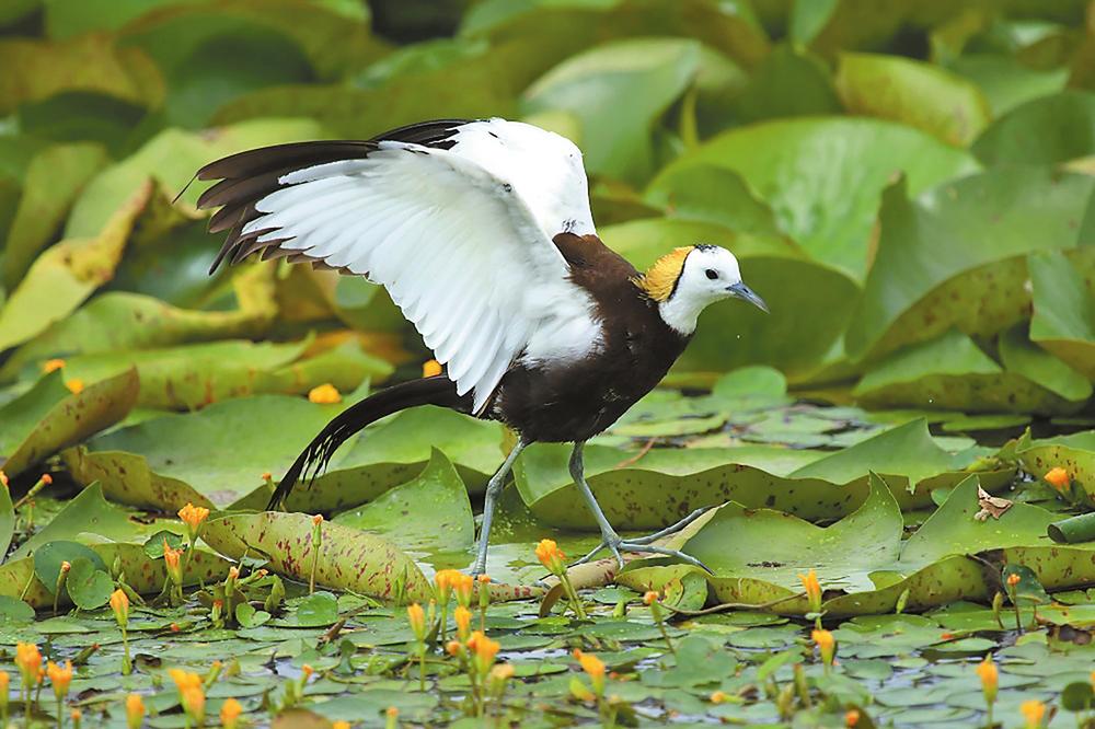 近年来,随着保山市青华海国家级湿地公园生态环境越来越好,每年夏季都会吸引各种水鸟到此栖息繁衍。日前,有“水上凤凰”“凌波仙子”之称的国家二级保护动物水雉在青华海翩翩起舞,引得市民驻足围观,成为了一道靓丽的风景。(云南日报 记者李建国 通讯员赵辉 摄)