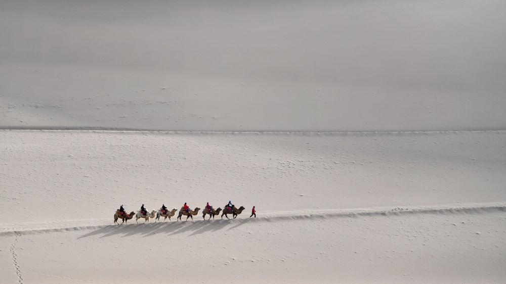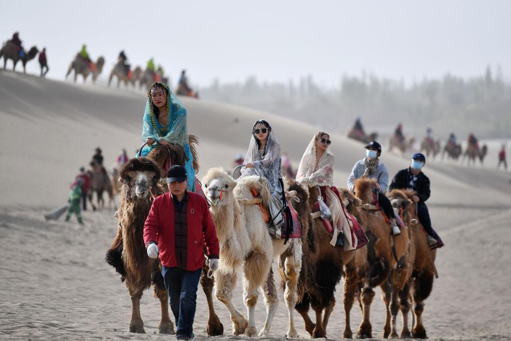 驼队载着游客行走在鸣沙山月牙泉景区的驼道上(2023年4月24日摄)。新华社记者 陈斌 摄