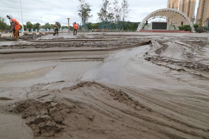 铲车铲起路上的大块淤泥倒入翻斗车,工人们有的手拿铁锹清理人行道,有的用水枪冲刷路面……9日下午,在尚志市东浦新区一座公园附近的道路上,洪水退去后的清淤工作正在进行。