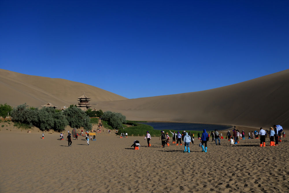 游客在敦煌鸣沙山月牙泉景区游览(2023年6月7日摄)。新华社发(张晓亮摄)