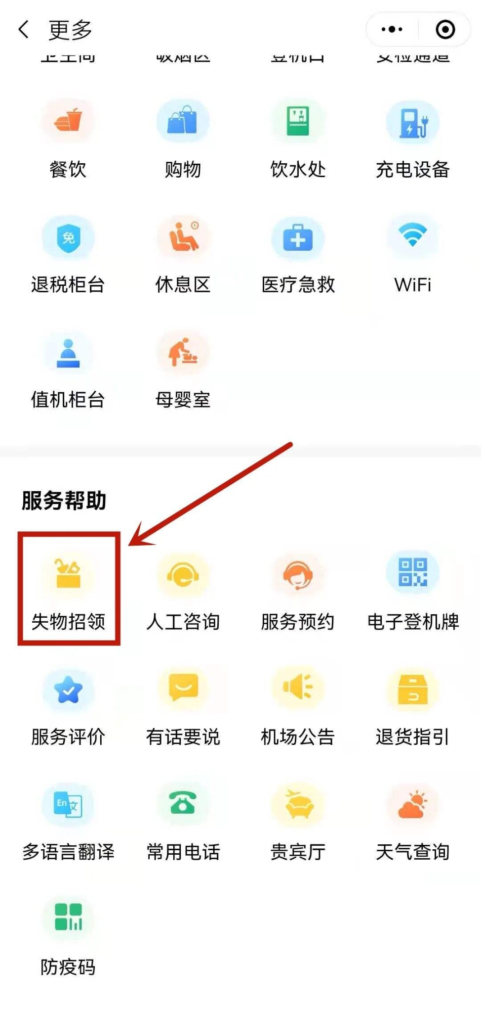 在小程序首页点击“更多”,进入找到“服务帮助”→“失物招领”,即可进入失物招领界面。