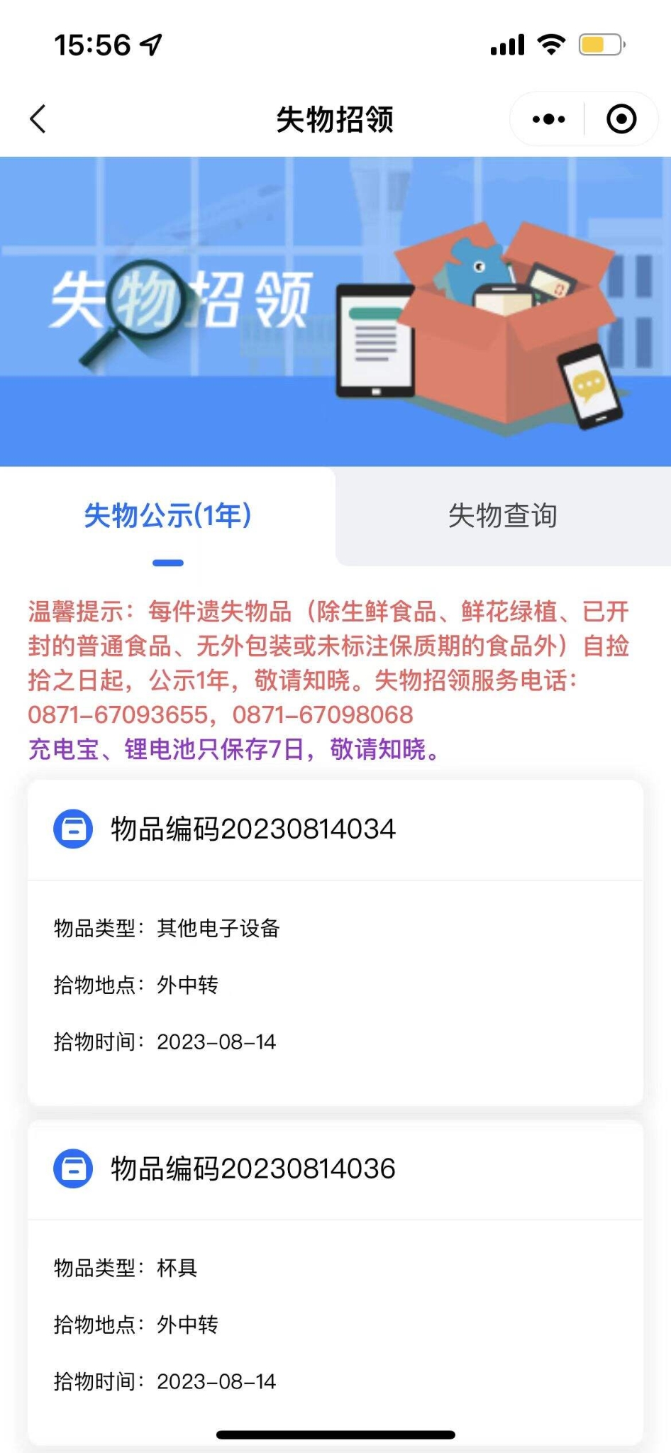 物品自捡拾之日起1年内,都会在“失物公示”界面进行公示(充电宝、鲤电池只保存7日),每件物品有单独编码,还有拾物地点和时间等信息;