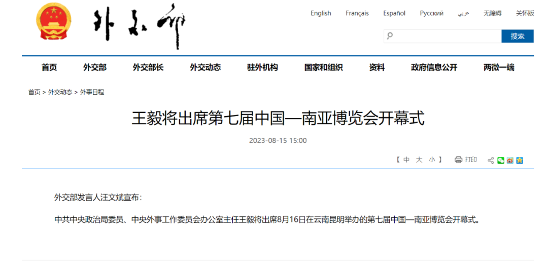 外交部发言人汪文斌宣布:中共中央政治局委员、中央外事工作委员会办公室主任王毅将出席8月16日在云南昆明举办的第七届中国—南亚博览会开幕式。