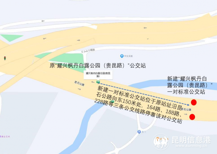 原“耀兴枫丹白露公园(贵昆路)”公交站位于昆石公路与G320辅路交叉口附近,新建的“耀兴枫丹白露公园(贵昆路)”一对标准公交站距离原公交站向东150米处,164路、188路、228路等三条公交线路停靠该对新建标准公交站。