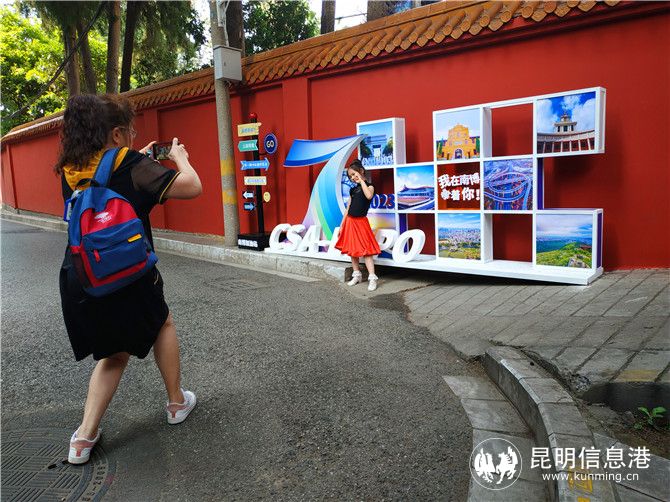 两个打卡点的正式名字,是“南博加油站”。每个打卡点都通过展板,将一批昆明地标建筑、网红公园用图片做了集中展示,并设置了“南博等你”“云南等你”“有一种叫云南的生活”“遇见南博遇见你”“南博好”“南博NO1”等宣传语,而“我在南博等着你!”则是打卡点的核心宣传语。