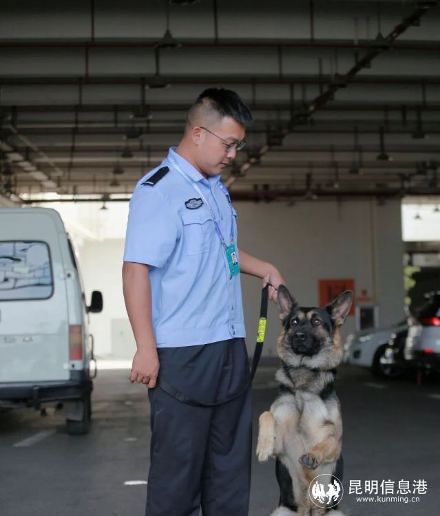 可乐是一只3岁半的昆明犬,这是它第一次参加南博会。早上5点,它便严阵以待,跟随训导员唐杰到达昆明滇池国际会展中心开始一天的新工作。
