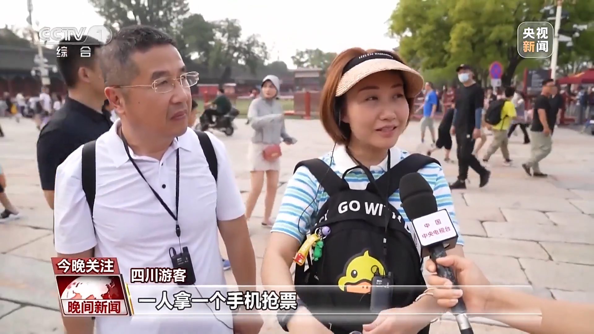 四川游客:预约挺久的,晚上我和她爸爸两个人一人拿一个手机抢票,一直点,抢到的,很不容易。