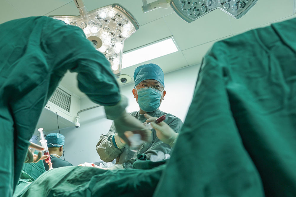 2023年7月6日,黄晓军在北京大学人民医院手术室采集供者的骨髓干细胞。新华社记者张玉薇 摄