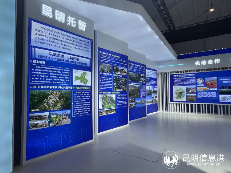 展区内的“昆明托管”展示板成为了大多数逛展游客驻足浏览之处,四块面板展示了昆明“五区一市”定向帮扶磨憨建设6个现代化边境幸福村的相关情况。