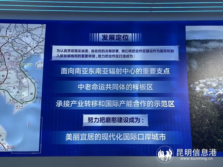 “打造为我国面向南亚东南亚辐射中心的重要支点、中老命运共同体的样板区、承接产业转移和国际产能合作的示范区,努力把磨憨建设成为美丽宜居的现代化国际口岸城市。”磨憨未来的发展定位与建设目标屹立在展区中央,目前,磨憨正如一列中老铁路上的高铁,以十足的马力在建设的道路上飞驰,各项工作持续提速、发展质量稳步提升。今天,我们在南博会上见证了昆明托管磨憨一年以来的建设成果;未来,磨憨将以现代化国际口岸城市的身份亮相走向世界更加广阔的舞台。(昆明信息港 记者王奕然)