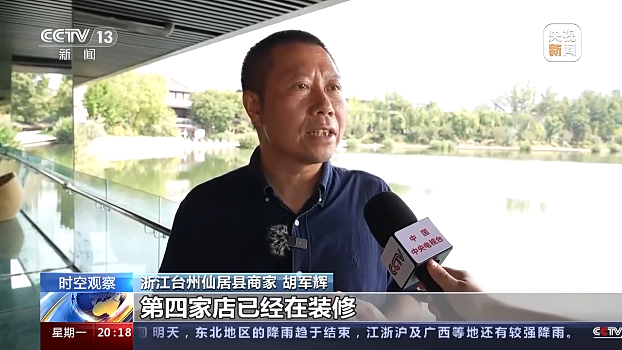 浙江台州仙居县商家 胡军辉:我们从一家店到三家店,第四家店已经在装修,马上也开业。我自己切身的感受就是因为游客多了,我们饭店里面就餐的客人也多了,对我们来说是一个重大的利好。