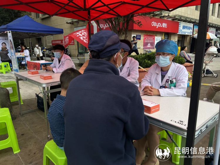 仪式结束,义诊活动随即开始。本次义诊,昆医附二院共有来自11个专业科室的14名专家参与,还带来了专业的护理团队,覆盖范围广,各个诊台前很快围坐起问诊的居民。医生一边耐心问诊,解答居民的健康问题,一边向居民讲解健康生活的注意事项,真正把医学知识传递到社区。