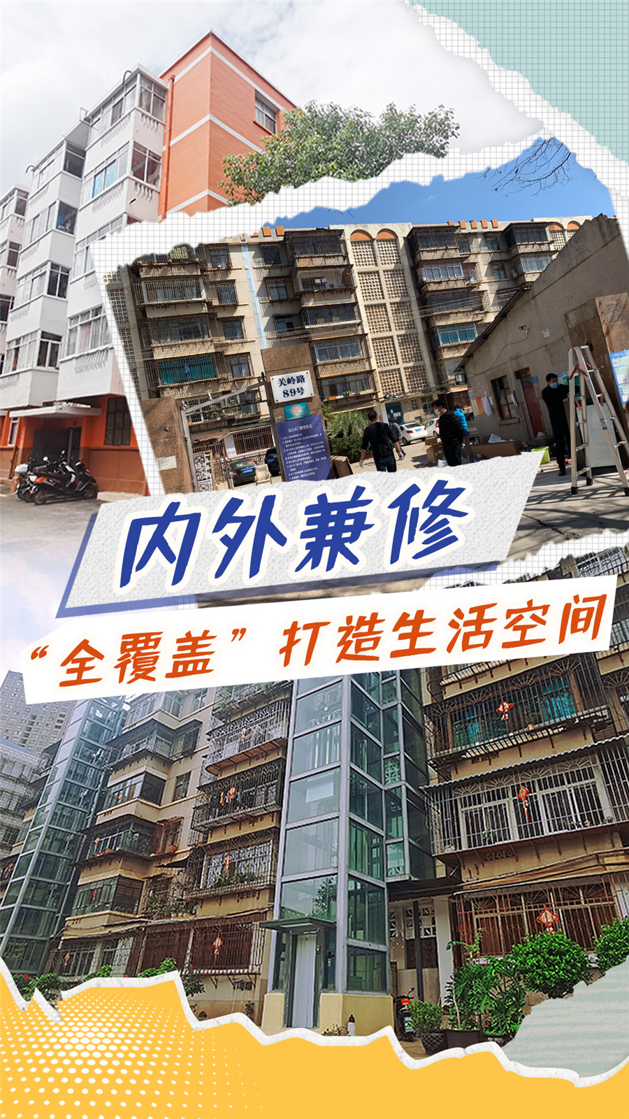 走进石虎关社区关岭路89号院, 住宅楼前耸立的加装电梯格外引人注目,平坦通畅的道路、整齐合理的管网,便捷十足的加装电梯,焕然一新的环境面貌让人眼前一亮,公共设施和绿化进行色调、设计的统一升级,收获了居民纷纷称赞。改造前,小区内楼房外立面风化脱落,水泥地面也有损毁,居住体验感较差,如今已华丽蝶变为赏心悦目的宜居家园。