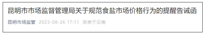 8月26日,记者从昆明市市场监督管理局获悉,为保障食盐价格秩序平稳,维护人民群众合法权益,昆明市市场监督管理局发布关于规范食盐市场价格行为的提醒告诫函。详情如下: