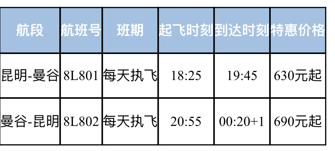 祥鹏航空昆明=曼谷航班计划于9月15日起每天往返,去程航班于18:25从昆明起飞,19:45到达曼谷,飞行时长预计2小时20分钟;返程于20:55从曼谷起飞,到达昆明时间为第二天00:20,飞行时长预计2小时25分钟(以上均为当地时刻)。