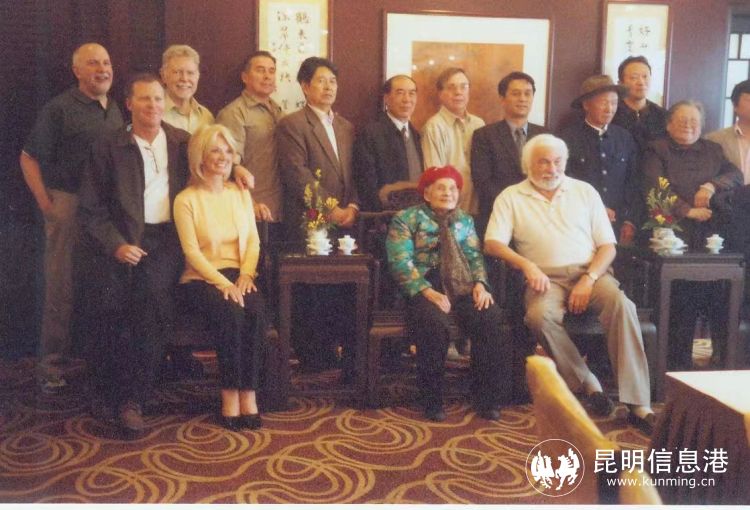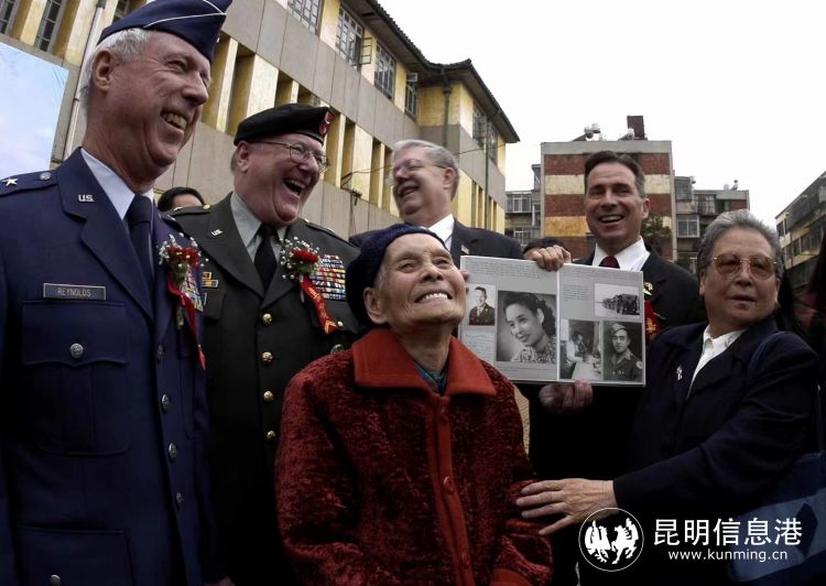 2004年在昆明原飞虎队招待所举办的活动中,杰夫格林、美国大使馆文化参赞裴孝贤,飞虎老兵邦德等与高德敏母亲黄欢笑合影。受访者提供