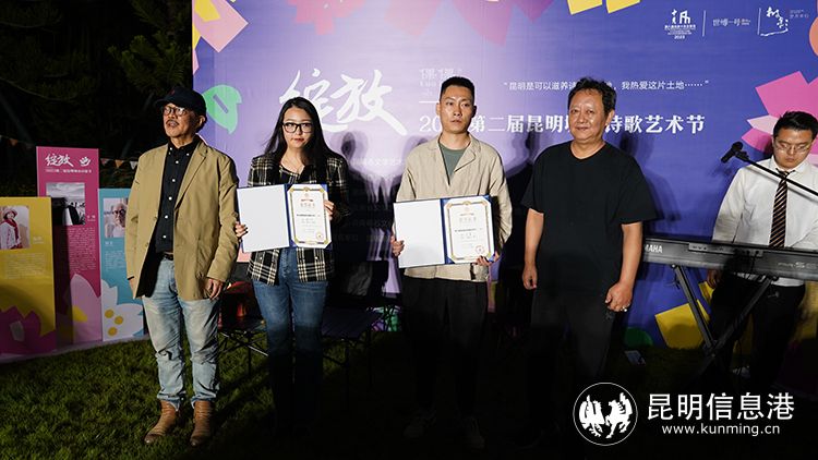 随着一首首浪漫的诗歌被朗诵,一首首乐曲被演唱,“绽放杯”昆明城市诗歌节征文大赛获奖名单也被揭秘。据介绍,本次“绽放”主题征文大赛受到了来自全国各地广大诗歌艺术爱好者的关注和支持,经过一系列严格的初评、复评、终评等环节,最终评选出一等奖1名、二等奖2名、三等奖3名。一等奖为河畔草(马丙丽)作品《绽放》(组诗);二等奖分别是谢竺轩作品《国王》(组诗),字童作品《字童的诗》;三等奖分别为冬千(刘锐)作品《花冠用来给时间加冕》(组诗),杨不寒作品《笔墨之绽放》(组诗),李昀璐作品《茉莉夜航》(组诗)。