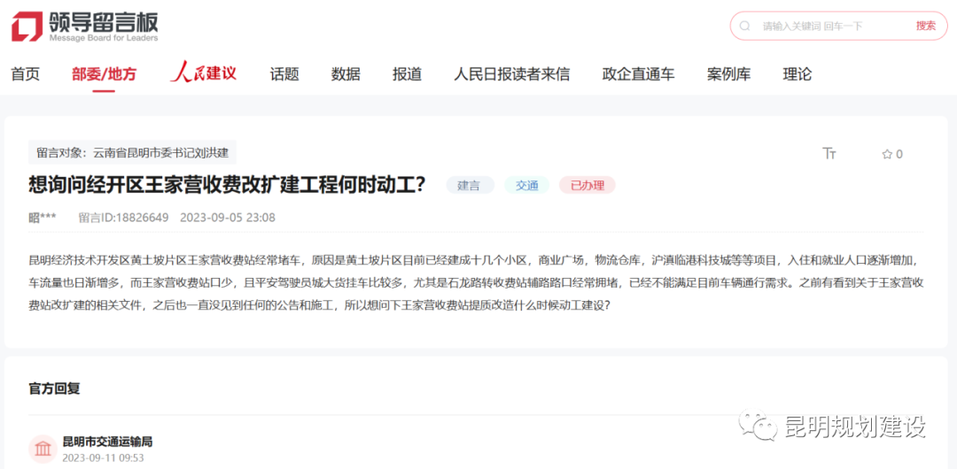 近日,针对网友在人民网领导留言板上关于“经开区王家营收费改扩建工程何时动工”的留言,昆明市交通运输局进行了回复。