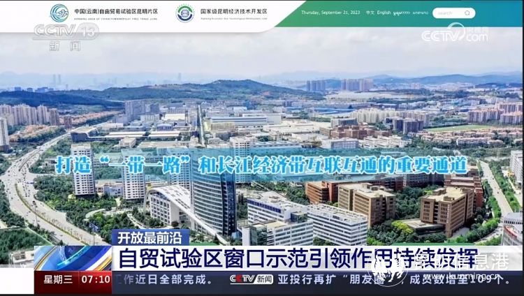 9月27日,CCTV-13央视新闻频道《朝闻天下》栏目在中国自贸试验区建设十周年系列报道——“自贸试验区窗口示范引领作用持续发挥”主题中,聚焦云南自贸试验区围绕窗口进行拓展深化的创新改革举措。报道指出,在云南自贸试验区,中文、英语、缅甸语、老挝语四种语言在这里的窗口无缝切换,多语种服务多国企业,构建面向南亚、东南亚的产业开放平台。