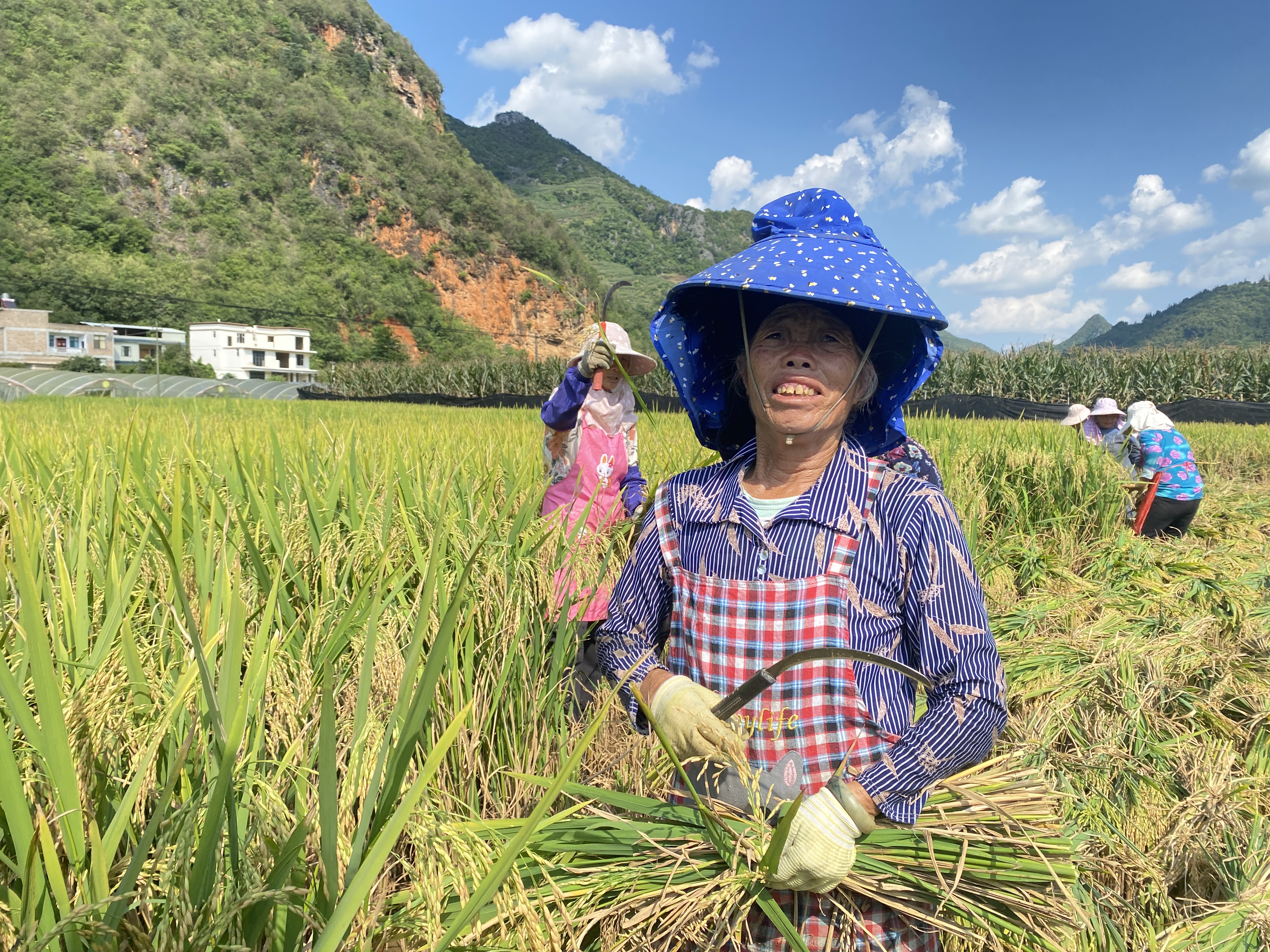 家住顺甸河大寨村的胡桂兰,一大早就叫上邻里亲戚来帮自己家收割水稻,只见大家在田里弯腰用镰刀熟练的收割着,不一会,王书芬家的稻田就收割了一大半。