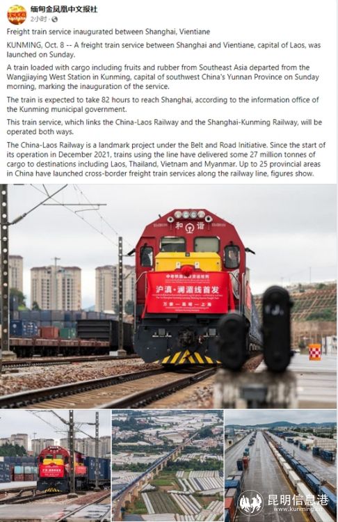 10月9日,缅甸《金凤凰》Facebook账号刊发题为《“沪滇·澜湄线”国际货运班列正式开通》的报道,文中说:“沪滇·澜湄线”国际货运班列于10月8日开通,一列满载着来自东南亚的水果和橡胶等货物的火车从中国西南部云南省省会昆明市的王家营西站出发……数据显示,中国已有多达25个省级地区开通了铁路沿线的跨境货运列车服务。