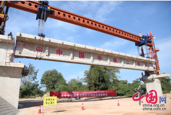 中老铁路-磨万项目首榀简支T梁在老挝首都万象成功架设。中铁二局融媒体中心 供图