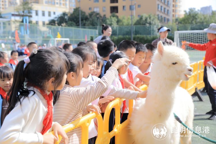 第二阶段为45分钟的互动课堂,1到3年级的同学在昆明动物研究所徐迦楠老师的讲解下,聆听了《蝴蝶的一生》科普知识讲座,并全神贯注的了解破茧成蝶的故事,寓意在以后的学习生活中要奋发图强、天天向上。4到6年级的师生体验课堂,在世界恐龙谷旅游股份有限公司赵文金讲师霸王龙出没的精彩开场表演下展开,随后又进行恐龙化石问答等趣味内容。活动现场,昆明野鸭湖度假区管理咨询有限公司还将羊驼带到学生操场,与小朋友们近距离互动。