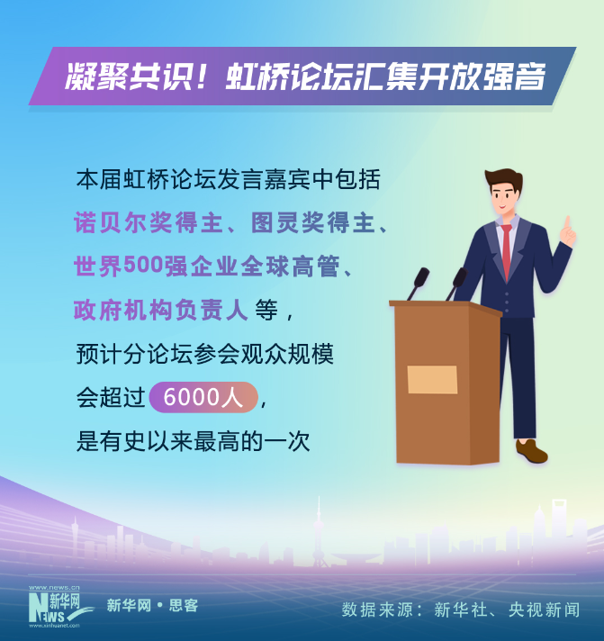 虹桥国际经济论坛是中国国际进口博览会的重要组成部分。随着进博会的“朋友圈”越来越大,虹桥论坛的影响力也不断提升。今年的论坛以“携手促发展,开放赢未来”为主题,发言嘉宾中包括了诺贝尔奖得主、图灵奖得主、世界500强企业全球高管、政府机构负责人等等,预计分论坛参会观众规模也会超过6000人,是有史以来最高的一次。