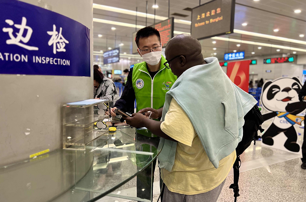 他出示进博会邀请函后,志愿者立即协助其填写外国人入境登记卡,并引向进博会边检专用通道,从下飞机到入境手续办理完成,全程用时不超过20分钟。