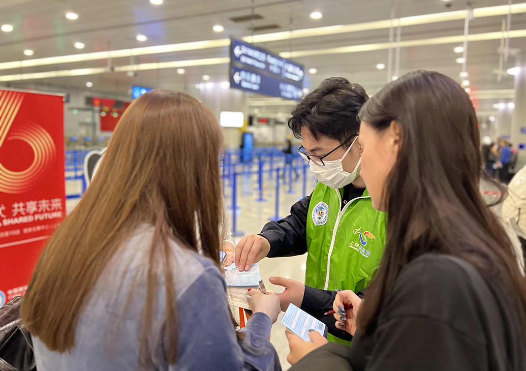 上海机场边检百人外语志愿服务队深入机场口岸一线开展进博会宣传和志愿服务工作。 黄波 摄