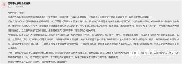 昆明信息港快讯 记者合宇聪 记者从昆明市公安局获悉,日前,有网友向昆明警方建议:“整治未拴绳犬只”。昆明警方11月3日留言回复,今年以来,全市公安机关持续组织全市开展文明养犬自觉行动,加大对遛犬不拴绳、不文明养犬行为的宣传、劝导、纠治和查处力度。其间,共开展集中宣传活动36次,发放各类宣传资料11388份,处罚不文明养犬行为人400余人次。