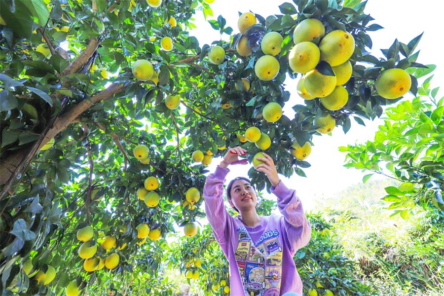 11月1日,大余县新城镇南丰村脐橙种植基地,村民在采摘赣南脐橙。当日,赣南脐橙统一开摘上市,各地果园一派繁忙景象。特约记者叶功富 摄