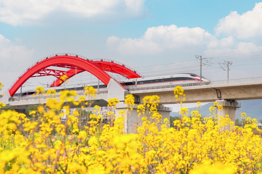 一列高铁列车从赣深高铁龙南特大桥驶过。(资料图片)